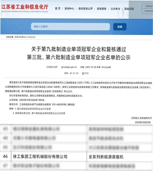 經徐州市推薦、江蘇省工信廳評選、協會專家評審、工信部審核等流程,徐工全系列新能源裝載機入圍“第九批制造業單項冠軍企業”名單。