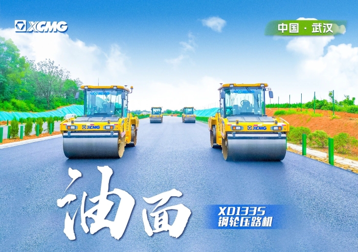緊跟著攤鋪工作上場的,是我們的老朋友——4臺XD133S雙鋼輪壓路機,由它們進行路面初壓及復壓。這款壓路機誕生之出就備受矚目,已經征戰過各類重大工程;尤其它的柔性行駛起停控制技術,能有效消除整機對路面的推擠,避免產生擁包,在提高路面平整度方面的實力有目共睹。