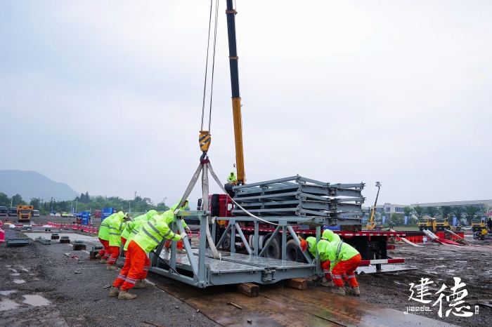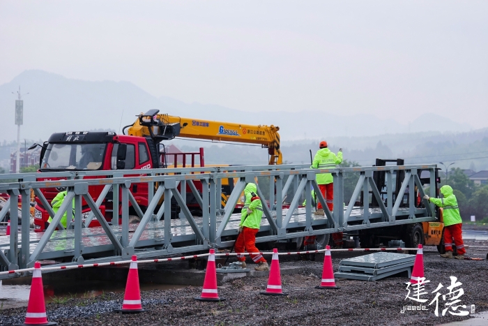 本次演練以山洪爆發(fā)、泥石流、臺風等極端氣候造成的道路內澇深坑積水、道路大面積塌方、公路橋梁沖毀以及危化品運輸車泄漏等特殊情況為背景,模擬公路水毀阻塞交通、橋梁垮塌中斷交通,演練隊伍嚴正執(zhí)行,在規(guī)定時限內迅速完成桁架拼裝、橋面鋪設、橋梁落座,完成公路應急裝備漕渡任務。