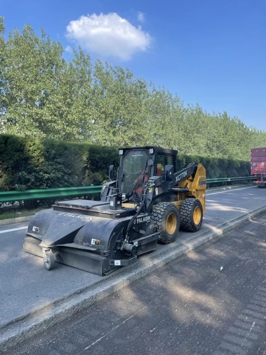 徐工滑移裝機搭配封閉式清掃器快速清理銑刨后的路面。