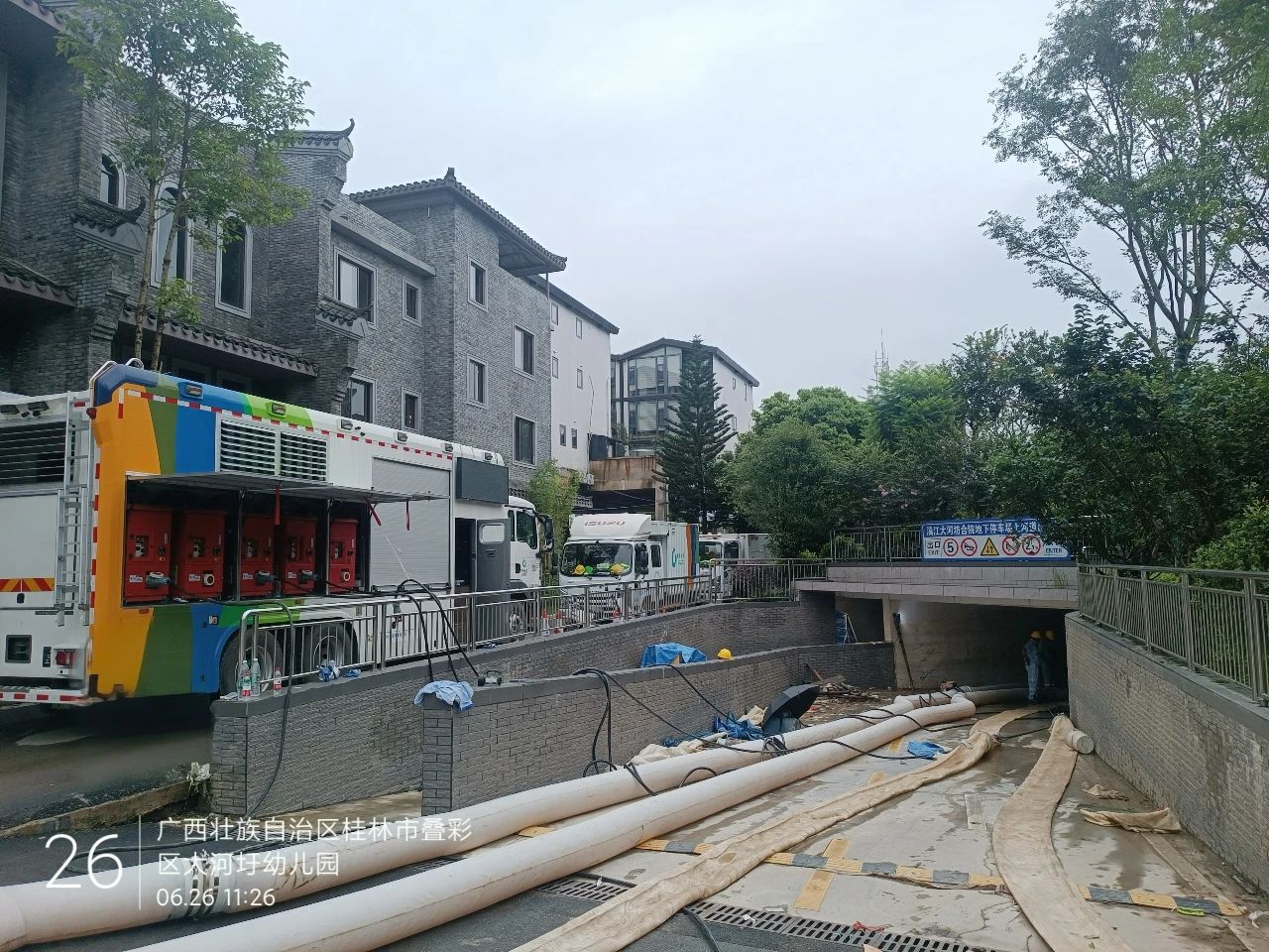 除桂林站地下停車場之外,徐工排澇產品還參與了桂林丹桂府小區(qū)以及大河圩旁的地下車庫內澇救援任務。