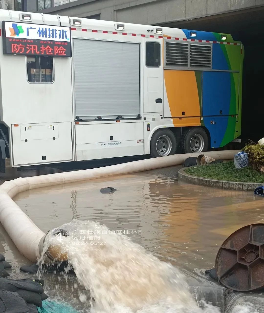 位于桂林七星區(qū)的丹桂府小區(qū),地下車庫占地面積超50000m3,高度約3.5m,也同樣遭受到洪水的侵襲。來自廣州排水的徐工PS50B泵組式大流量排水搶險車迅速趕來,進行定點強排作業(yè)。十余小時加大馬力連續(xù)抽排積水。順利完成任務后,該臺設備又迅速趕往下一救援場地。