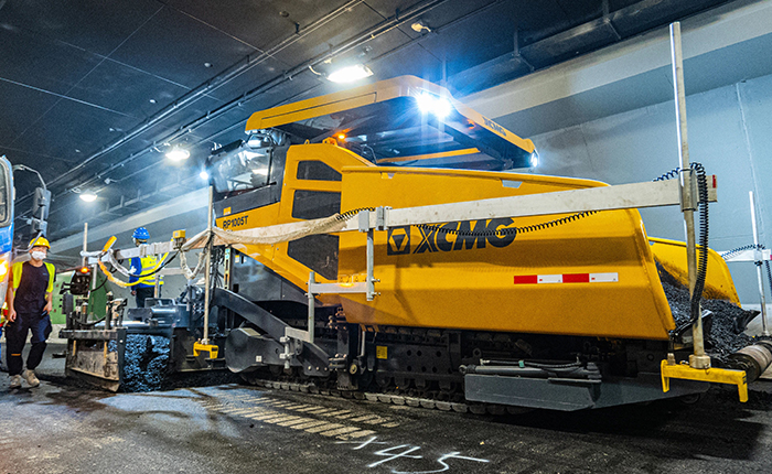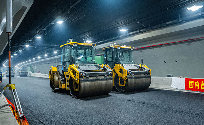 此次隧道路面鋪設(shè)工藝,是國(guó)內(nèi)首次在城市低空長(zhǎng)隧道中進(jìn)行無(wú)人攤鋪、壓實(shí)新工藝應(yīng)用。鋪筑后路面密實(shí)度達(dá)99.9%,平整度比傳統(tǒng)提升20%,滲水構(gòu)造深度達(dá)100%。