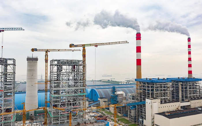 側望長江畔,機器轟鳴、江水潺潺,華能太倉電廠機組擴建項目施工現場一派繁忙景象,XGT3100-160S、XGT1350-64S兩臺徐工超大塔穩穩矗立在高聳的鋼架間吊裝作業。