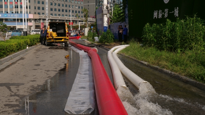 調試車輛、鋪設水帶、檢查管路,現場排水作業緊鑼密鼓地進行著。XGH5030TPSQ6爭分奪秒與時間賽跑,每臺車流量超600m3/h,最大可達1000m3/h,將積水源源不斷地排入下水道中。