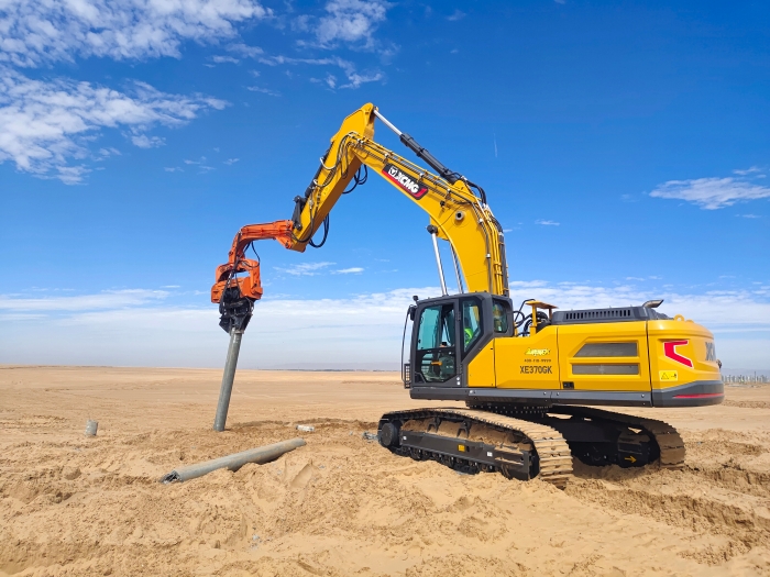 與以往常規(guī)項(xiàng)目不同,此次徐工挖掘機(jī)主要擔(dān)任光伏樁的鋪設(shè)工作,通過(guò)改裝振動(dòng)錘和引孔機(jī)等多功能屬具,有效滿足現(xiàn)場(chǎng)多元化施工需求。