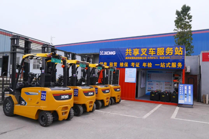 在重慶某大型物流園區,累計超120臺徐工新能源共享叉車被投入使用。這些共享叉車24小時待命,園區內的服務站里不時有老板、叉車司機進行充換電和現場掃碼解鎖。
