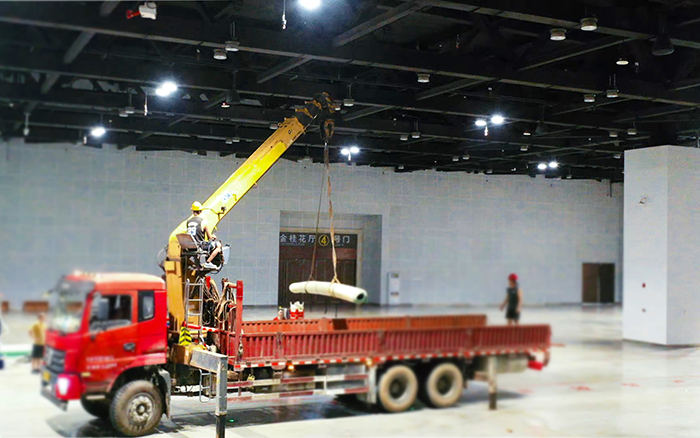 在廣西國際會展中心體育場館塑膠鋪設施工現場,徐工隨車起重機以硬核實力成為工程推進的 “主力軍”,贏得客戶連連稱贊。