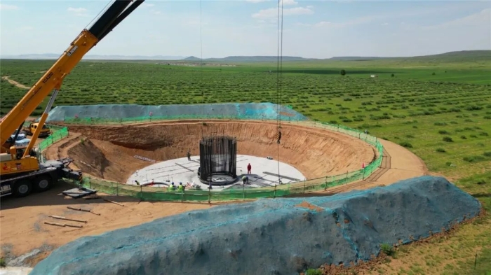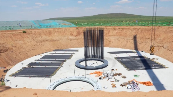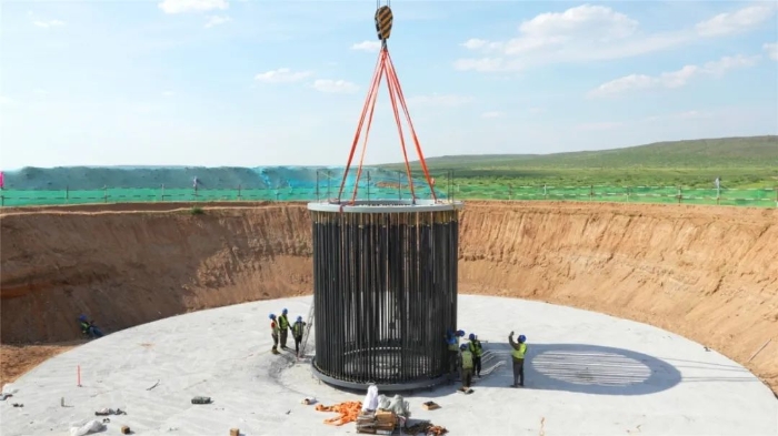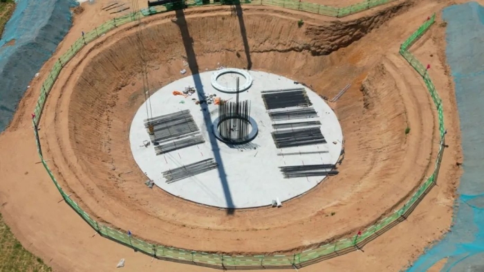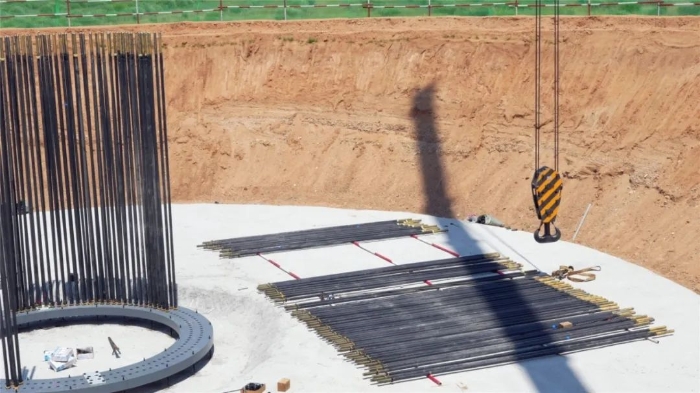 此次進行的是風電基礎吊裝,重達17噸的鉚盤穩(wěn)落在基坑,214根鉚桿密集插裝,每一根都必須精準插入孔位。