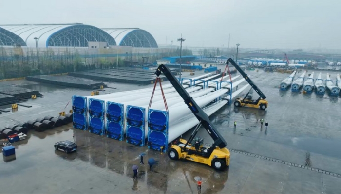 本次交付的國產最大噸位風電正面吊XCS70KS,可實現70噸/4米貨物吊裝,60噸/4米貨物帶載行走作業,雙機可抬吊140噸貨物,大幅提升港口大、重件轉運效率。
