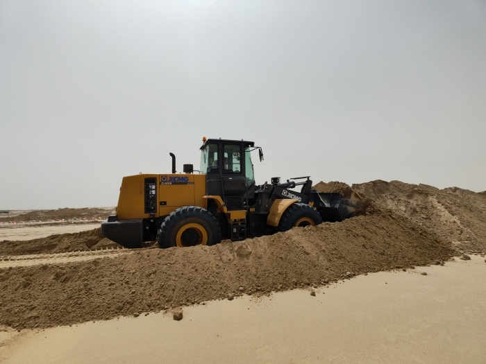 當地金光閃耀的沙漠地帶是極具標志性的景觀,數臺徐工ZL50GN裝載機正在其中緊張作業。擔負起土方搬運、路基平整、材料裝卸等關鍵任務,在高溫、多塵的惡劣環境下依然表現出眾,成為不可或缺的重要力量。