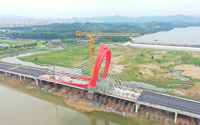 在大別山腹地、金寨縣史河河畔,“紅色搖籃”傲視遠方,徐工XGT2230-100S塔機揮舞著巨臂,隨著重達40噸的主橋鋼塔柱最后一個節段起吊安裝到位,金寨史河大橋主塔順利合龍。