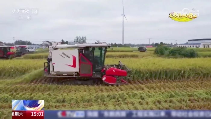 9月20日,中央電視臺新聞頻道《新聞直播間》“在希望的田野上”欄目將鏡頭對準湖北應城,報道了八臺徐工XR720履帶式谷物聯合收獲機在當地開展大規模糯稻收割的豐收盛景——履帶滾滾,金黃的稻穗迅速被吞入機器,頃刻間完成收割、脫粒、清選等一系列作業,顆顆飽滿的籽粒穩穩落入糧倉。
