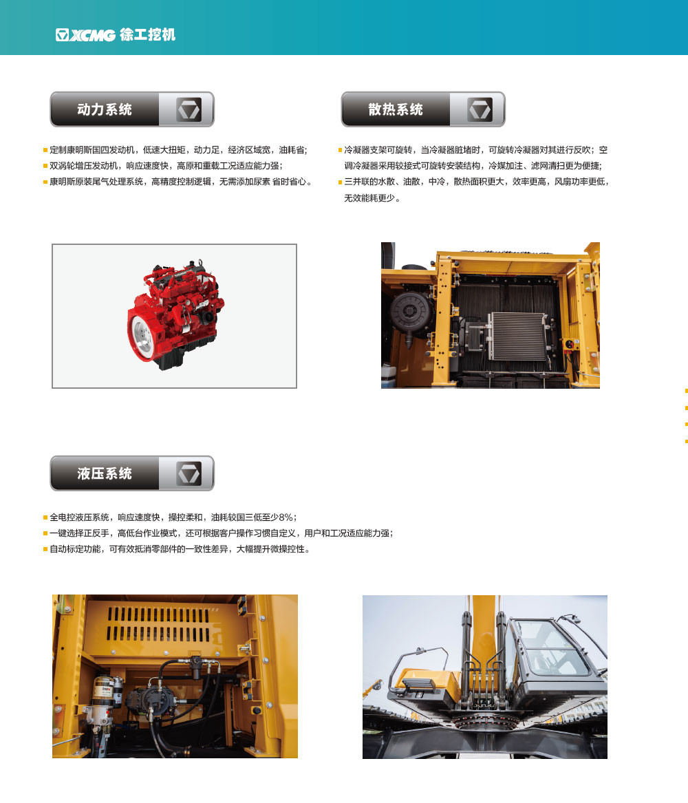 • 徐工定制化康明斯雙增壓發動機,儲備動力足,響應快, 高原適應性好。